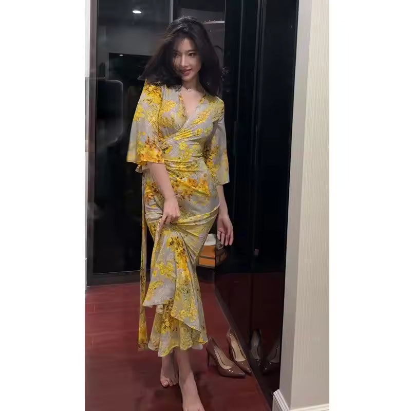 Robe Longue Fleurie Taille Haute Style Français
