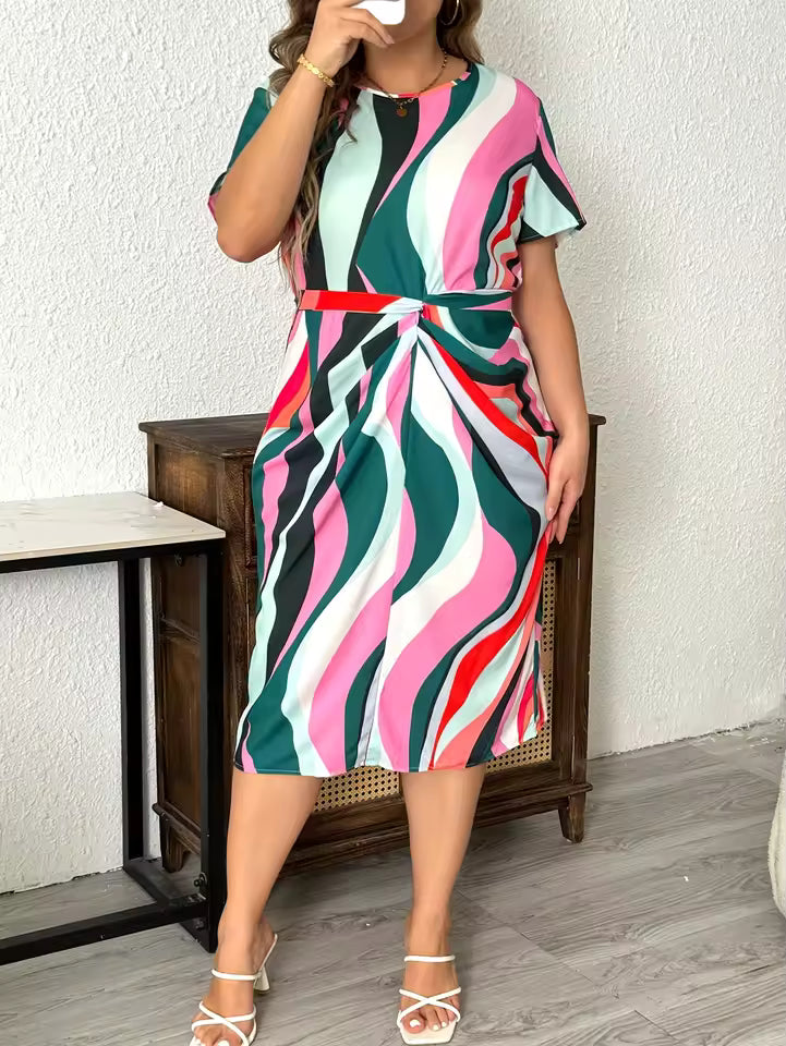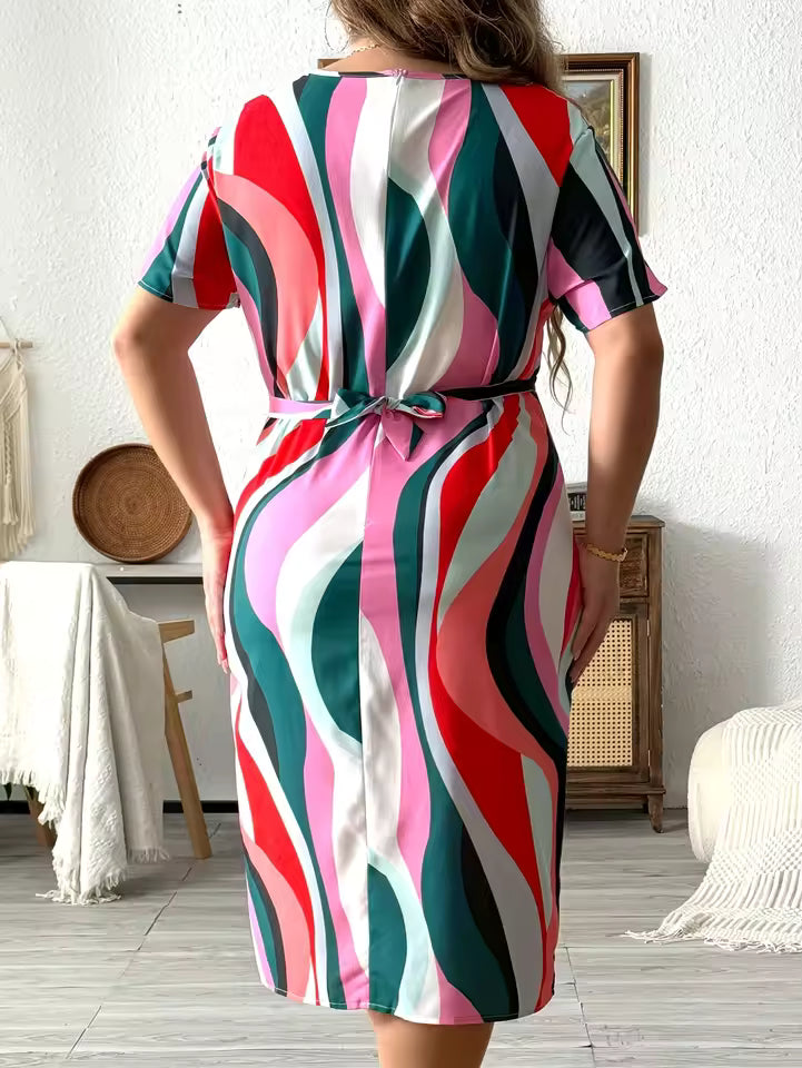 The plus size geometric print belted dress is designed to combine elegance, comfort, and modern style. Perfect for spring and summer, it offers a polished look suitable for both casual and semi-formal occasions.