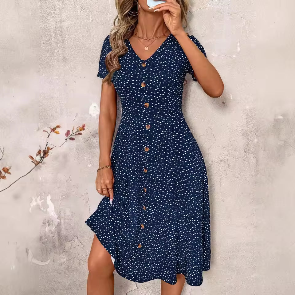 Le col en V avec boutons met en valeur le décolleté tout en ajoutant une note élégante.