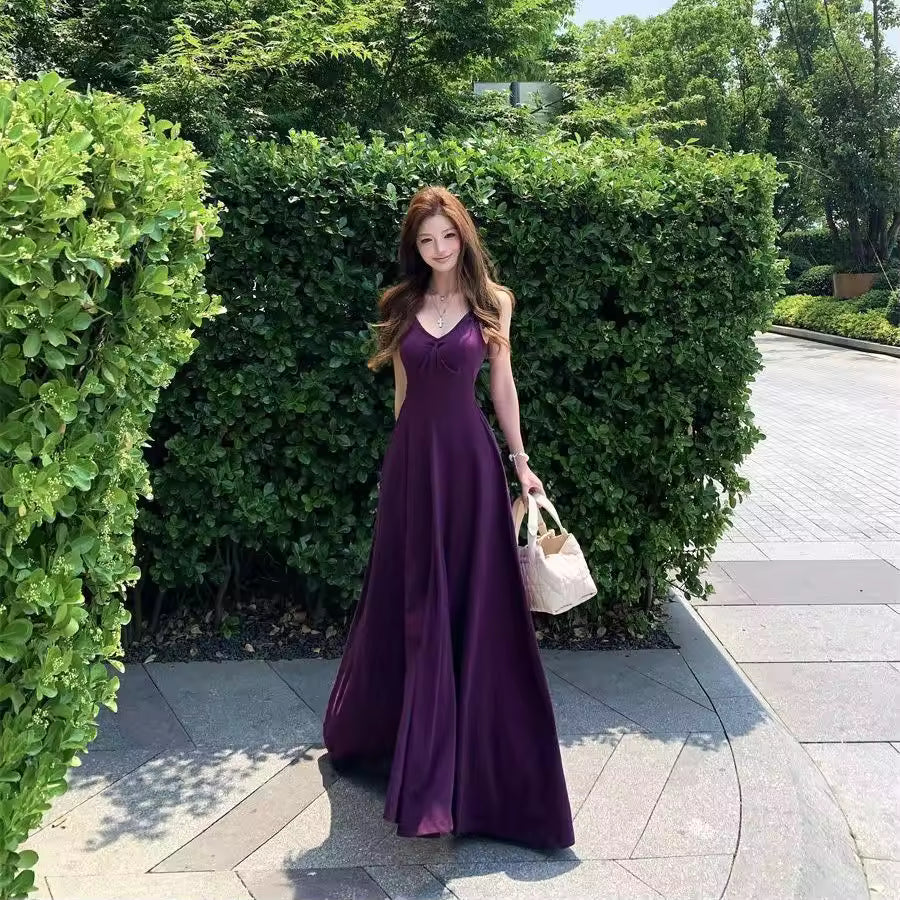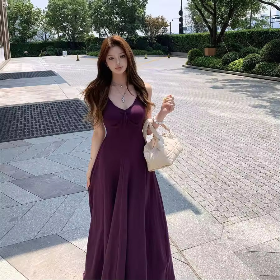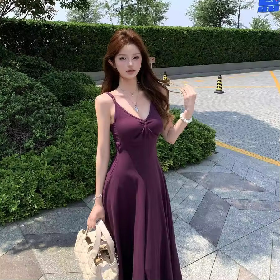 The elegant purple folded strap dress is designed to deliver a refined, fashionable look for summer. Its graceful silhouette and rich color create a standout yet timeless style.